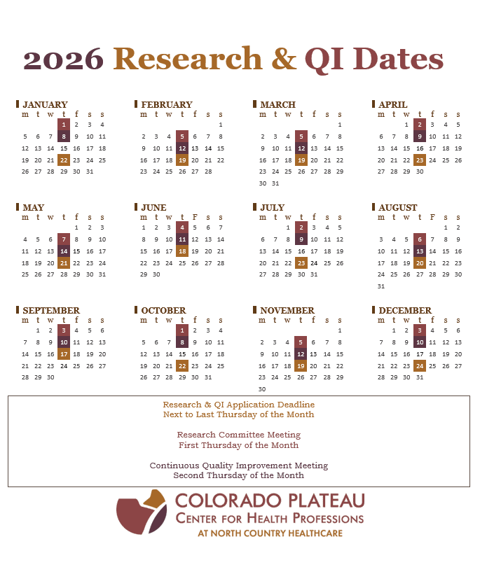 North Country HealthCare Research Committee meetings are held on the first Thursday of each month. Deadlines to submit research materials are 2 weeks prior to the meeting date. An application deadline calendar is posted to our research website outlining the specific dates. Please ensure you are aware of these deadlines, as a failure to submit research materials before the deadline will result in the postponement of review until the following month’s meeting.